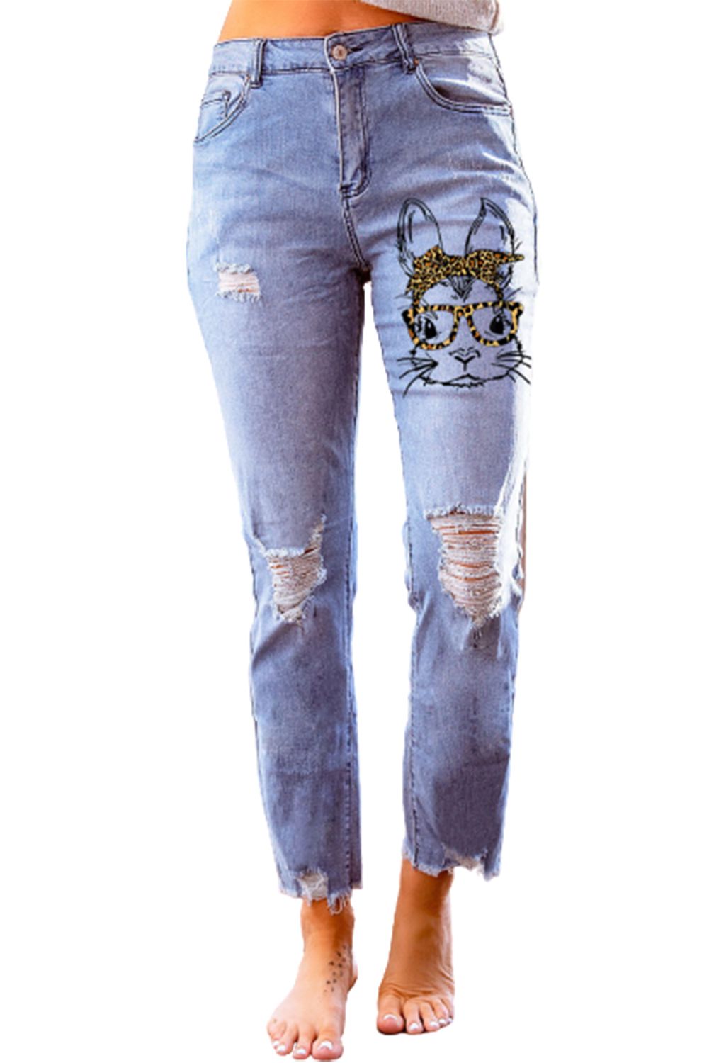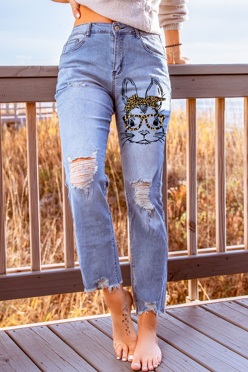 Sky Blue Easter Rabbit Leopard Print Distressed Ankle Jeans
