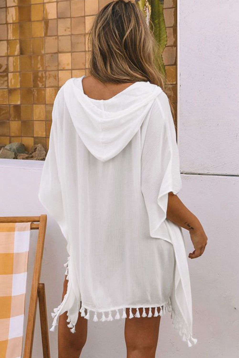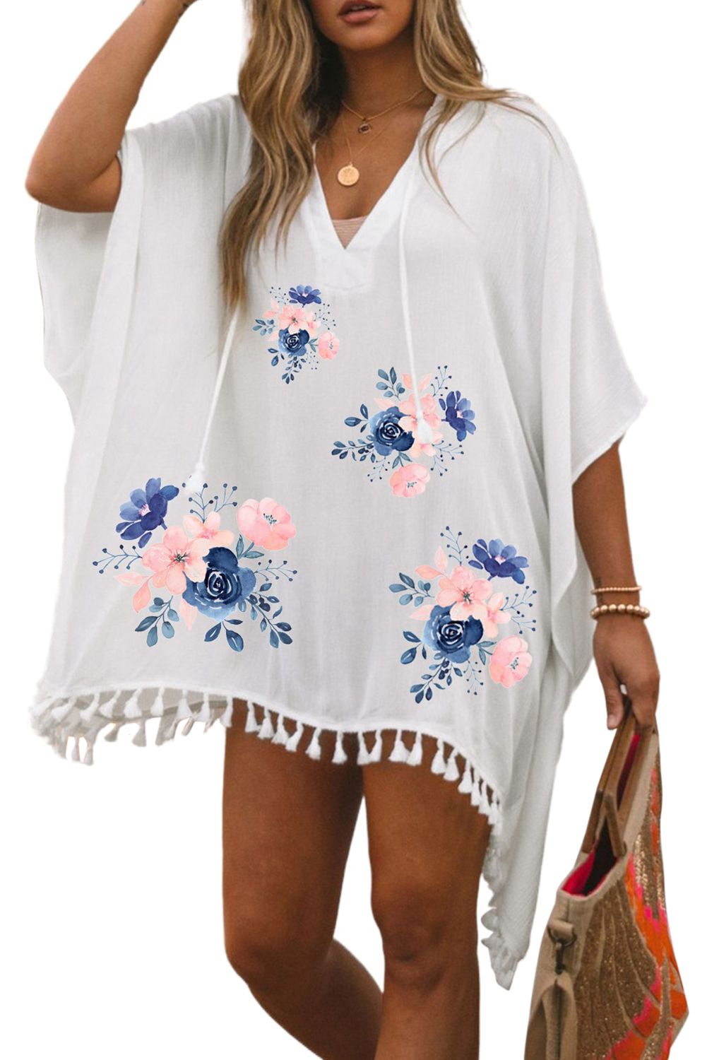 White Floral Print Fringe Trim Hooded Oversized Beach Cover Up