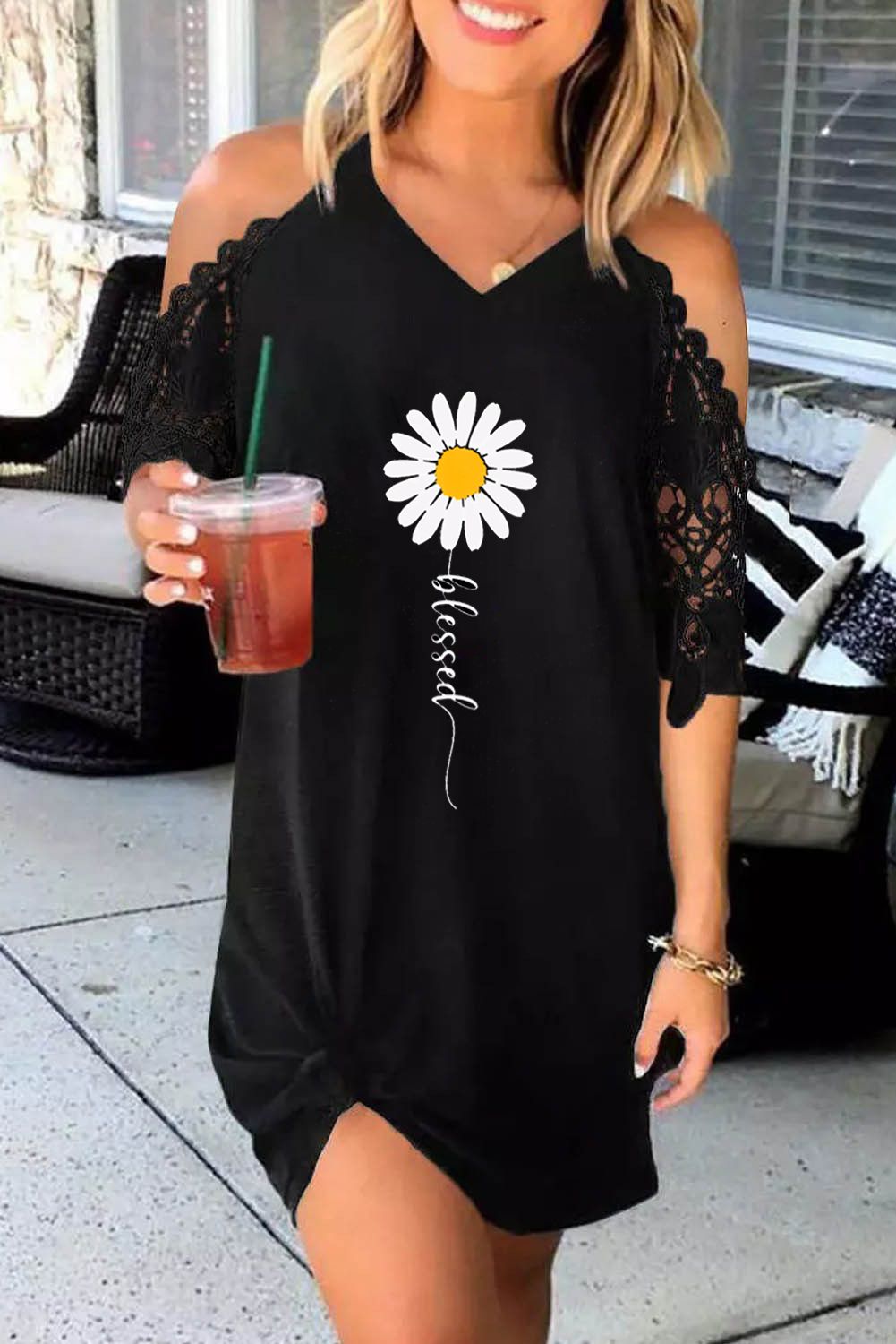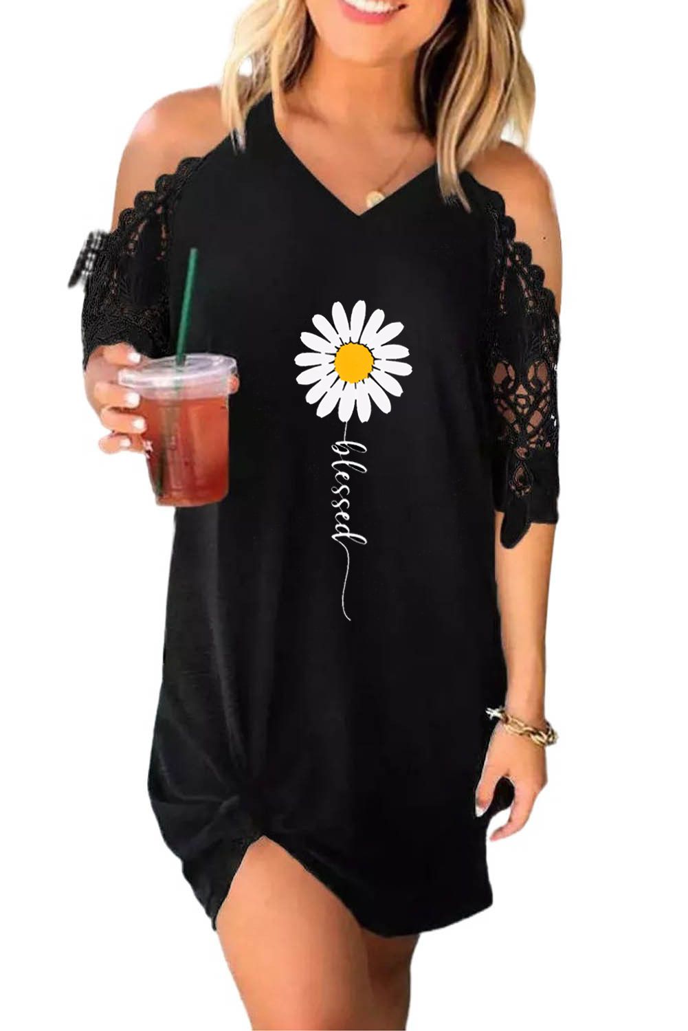 Black Blessed Daisy Print Lace Sleeve Ruched Mini Dress