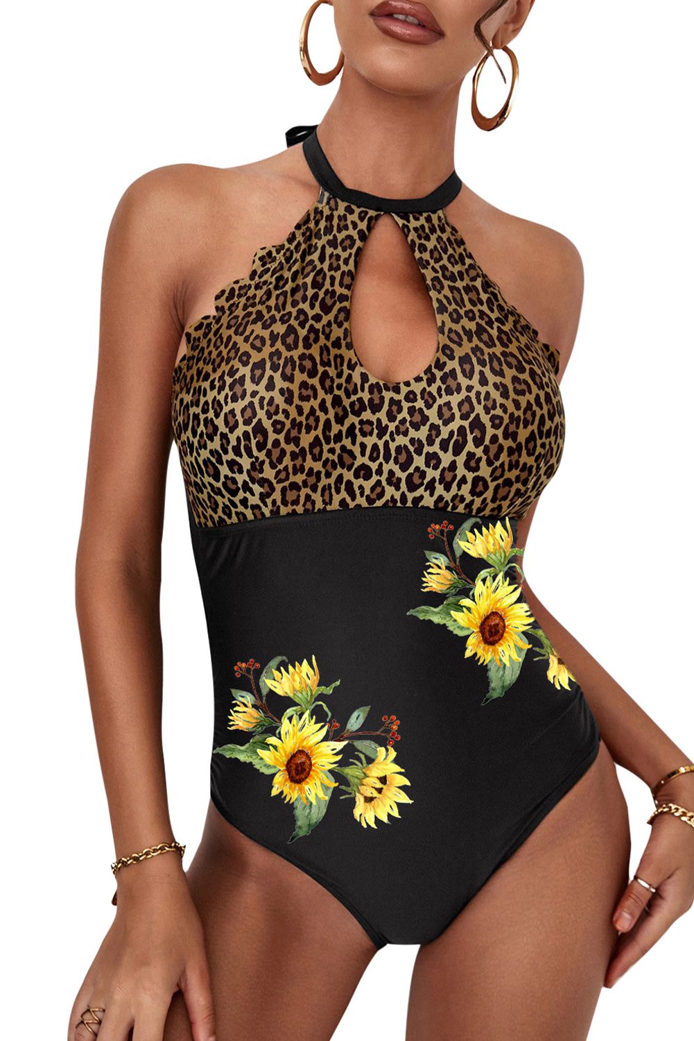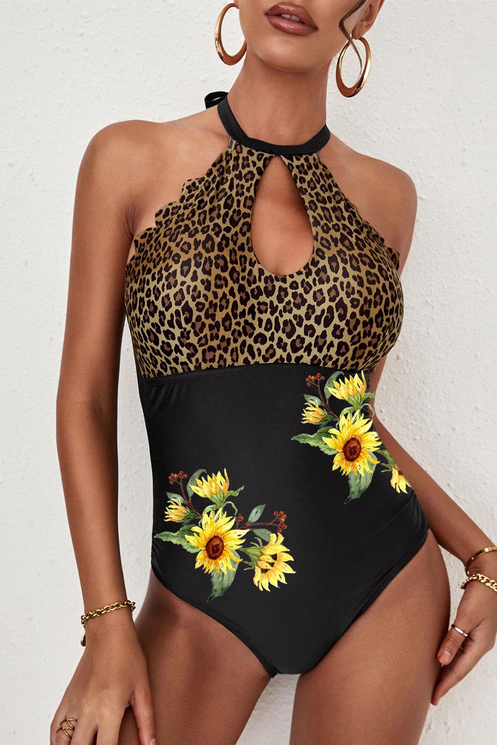 Floral Leopard Print Cut-out Halter Backless One-piece Swimsuit