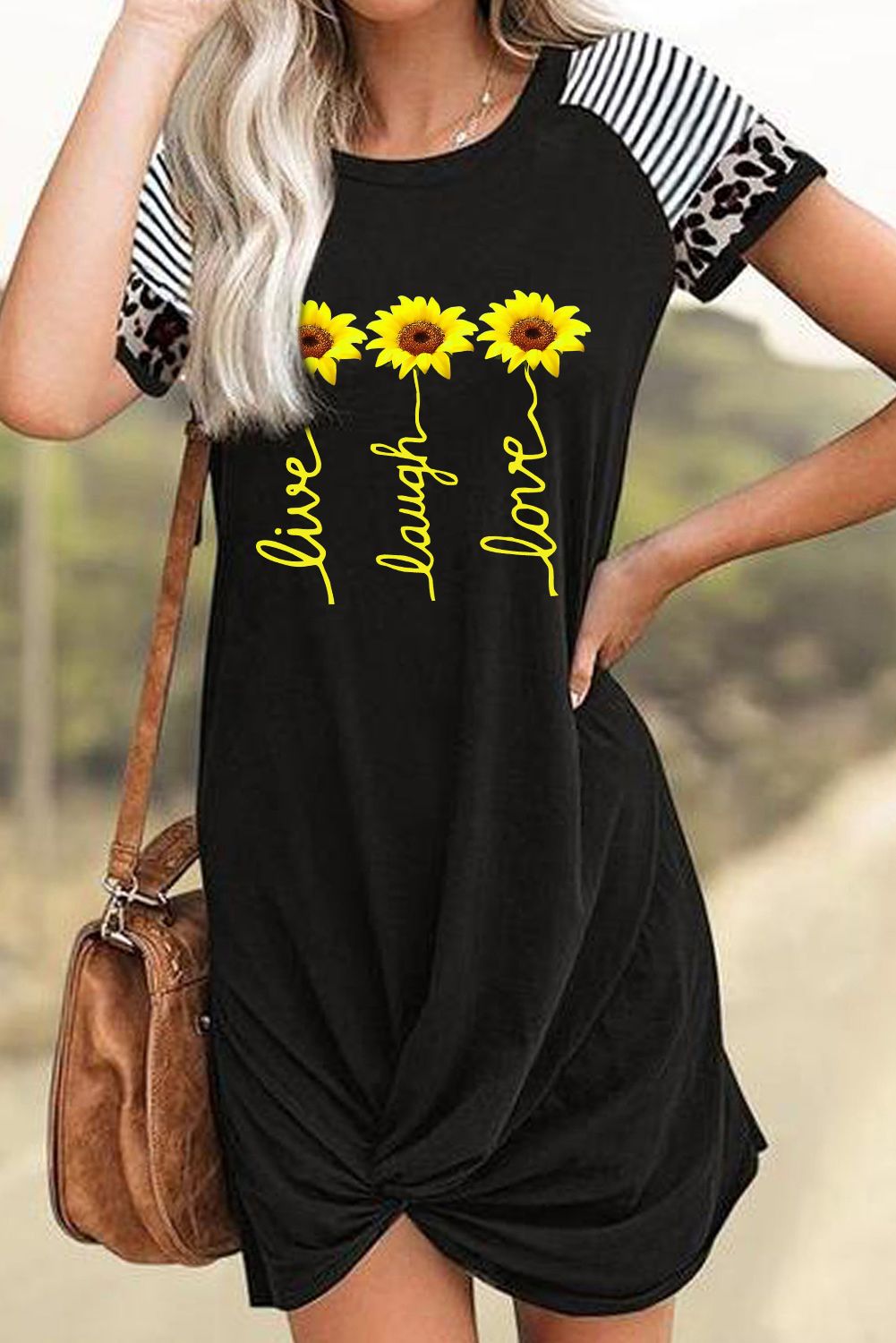 Features striped leopard mixed prints at sleeves and chic sunflowers on the frontCasual mini dress with crew neck, short sleeves, twisted hem and loose fit designMade from premium and super soft, this shift dress is cozy, stretchy and breathable on your skin, you’ll stay comfy all day longShort dress with a loose and straight design can well modify your figureGraphic dresses wholesale are perfect to pair with your high heels or sneakers as a good choice
