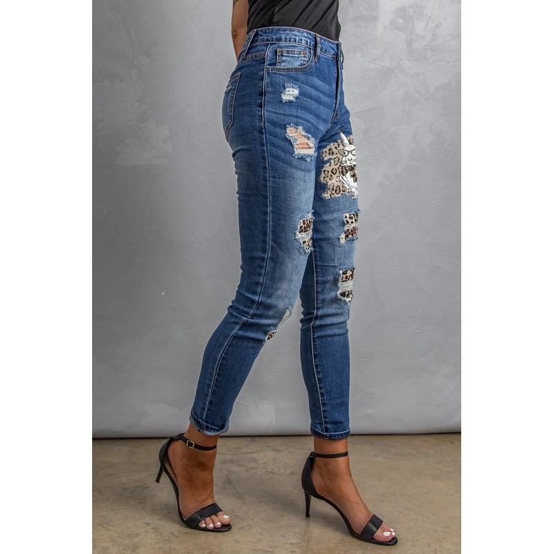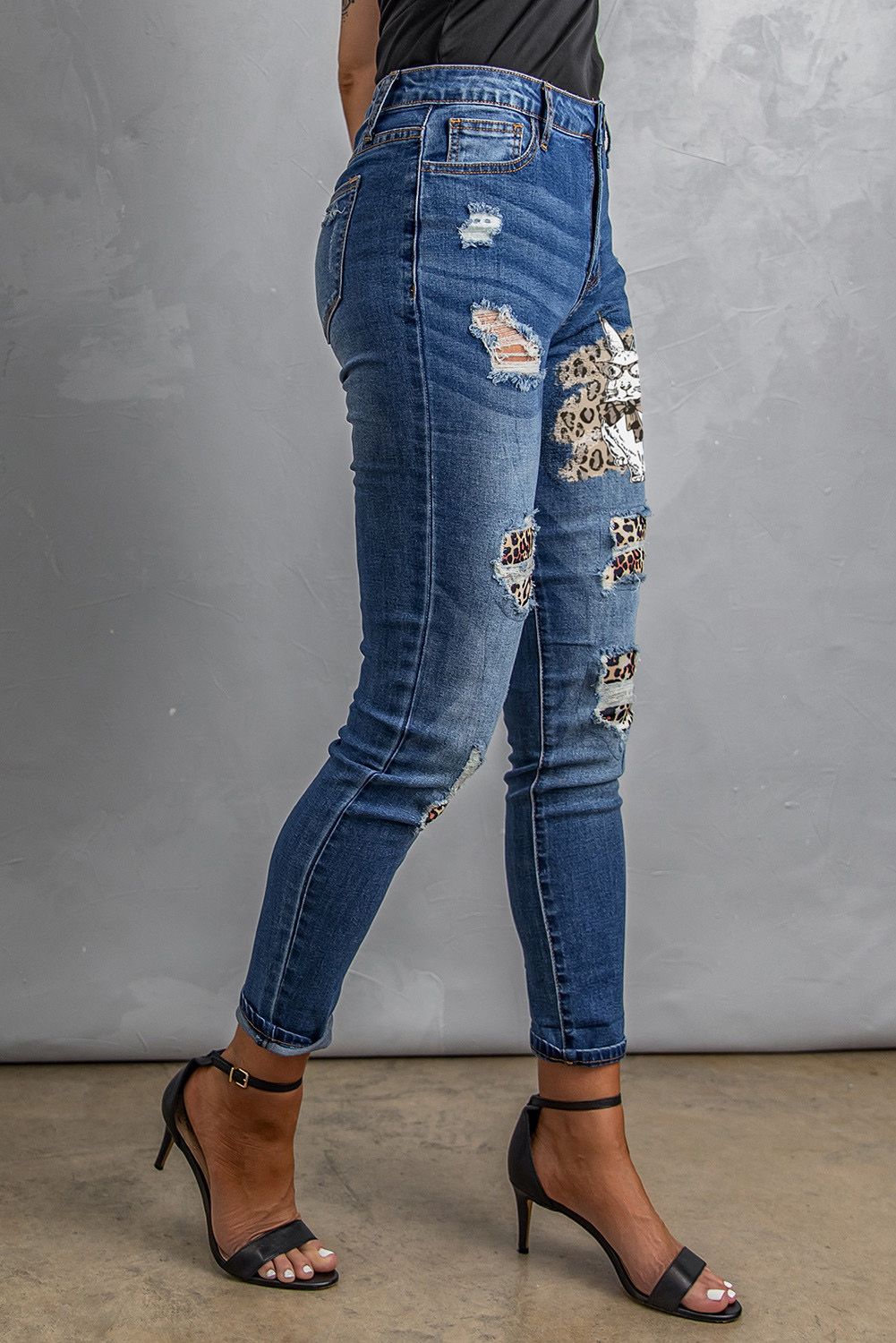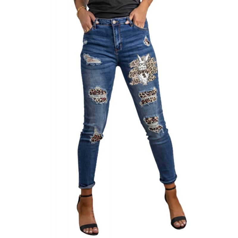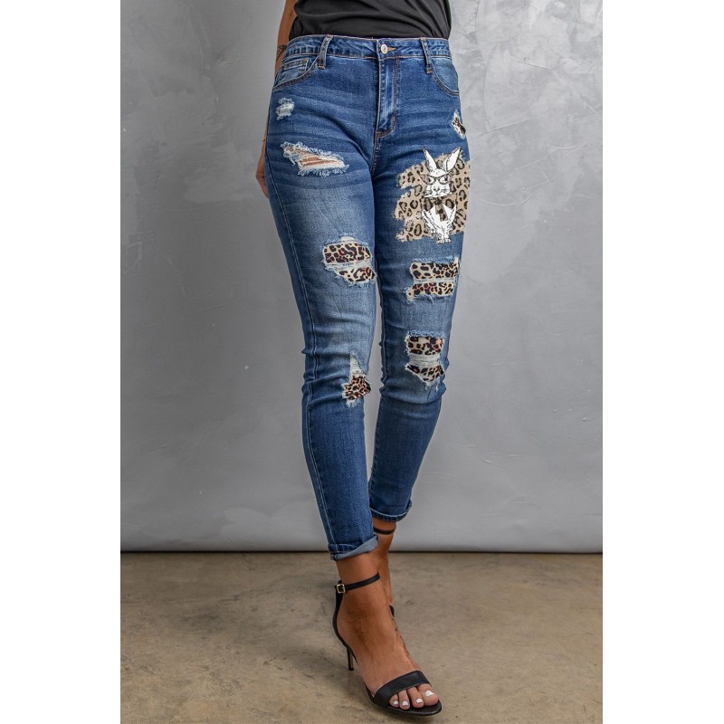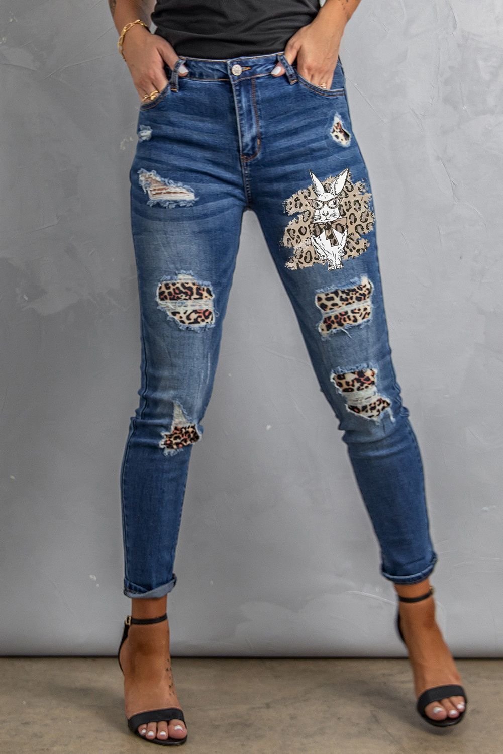 Easter Leopard Bunny Print Patchwork Distressed Skinny Jeans