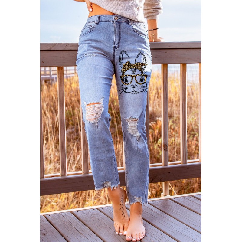 Sky Blue Easter Rabbit Leopard Print Distressed Ankle Jeans