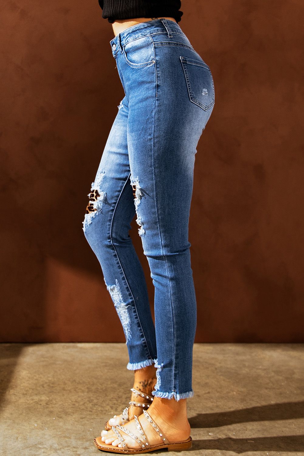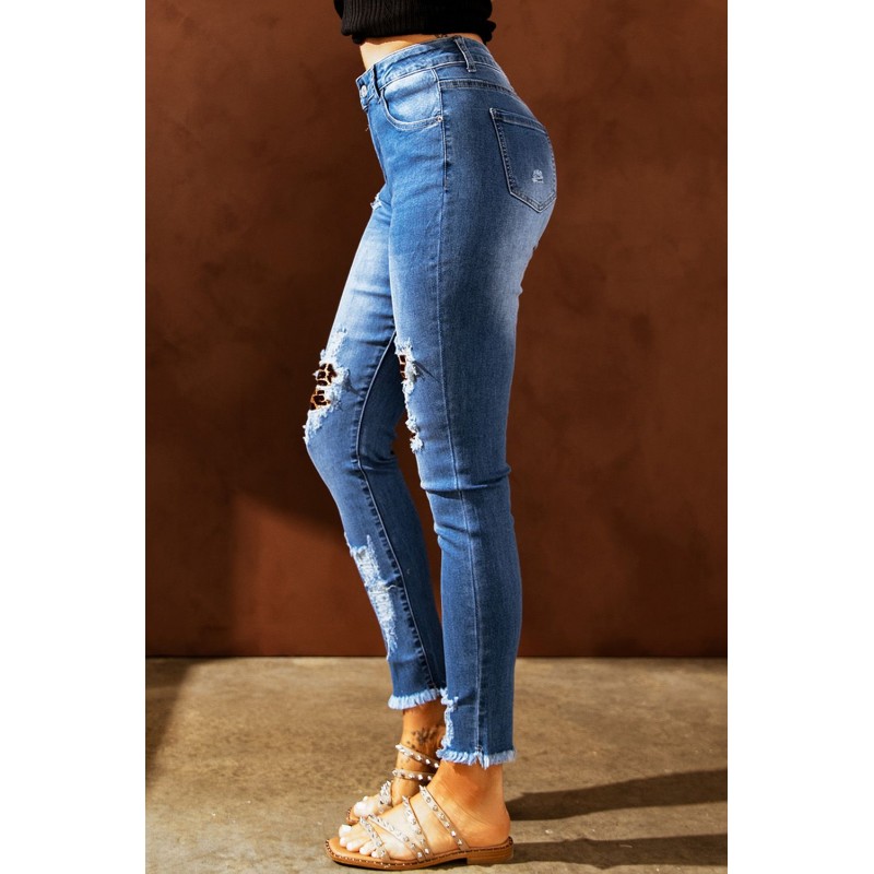 Sky Blue Leopard Splicing Skinny Distressed Ankle Jeans