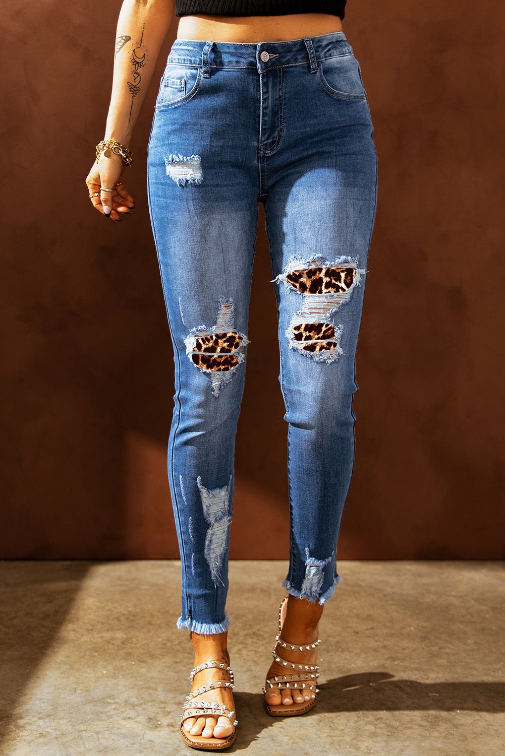 Leopard Splicing Skinny Distressed Ankle Jeans