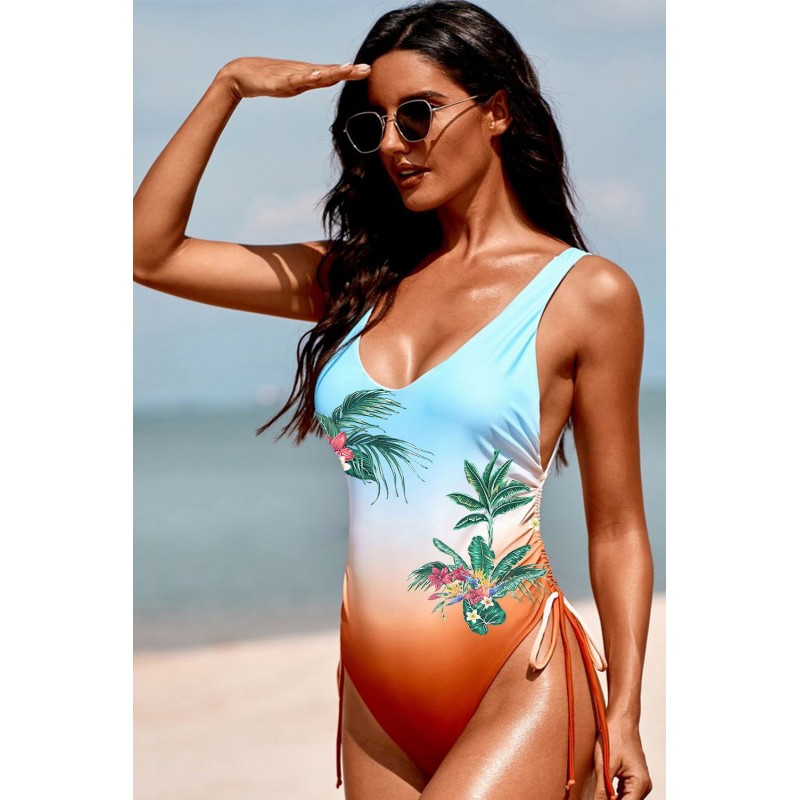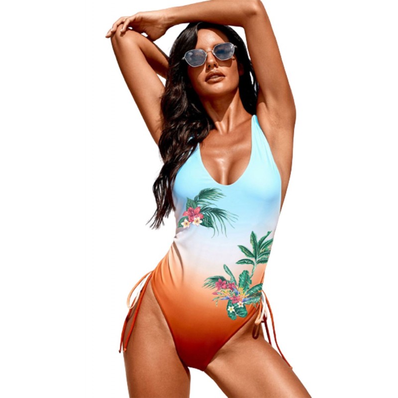 Floral Plant Gradient Color Print Drawstring One-piece Swimsuit