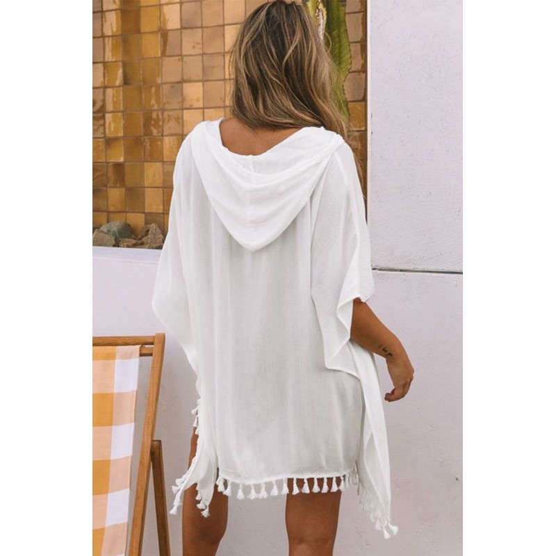 White Floral Print Fringe Trim Hooded Oversized Beach Cover Up